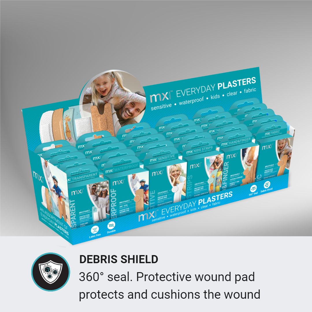 Explore our plaster display showcasing six diverse designs suitable for various wounds. Crafted with breathable material and a 360-degree seal, it effectively prevents dirt ingress, ensuring protection for all types of wounds. The protective wound pad cushions and shields the injured area. All plasters are latex-free and hypoallergenic, and their robust adhesion ensures they stay securely in place.